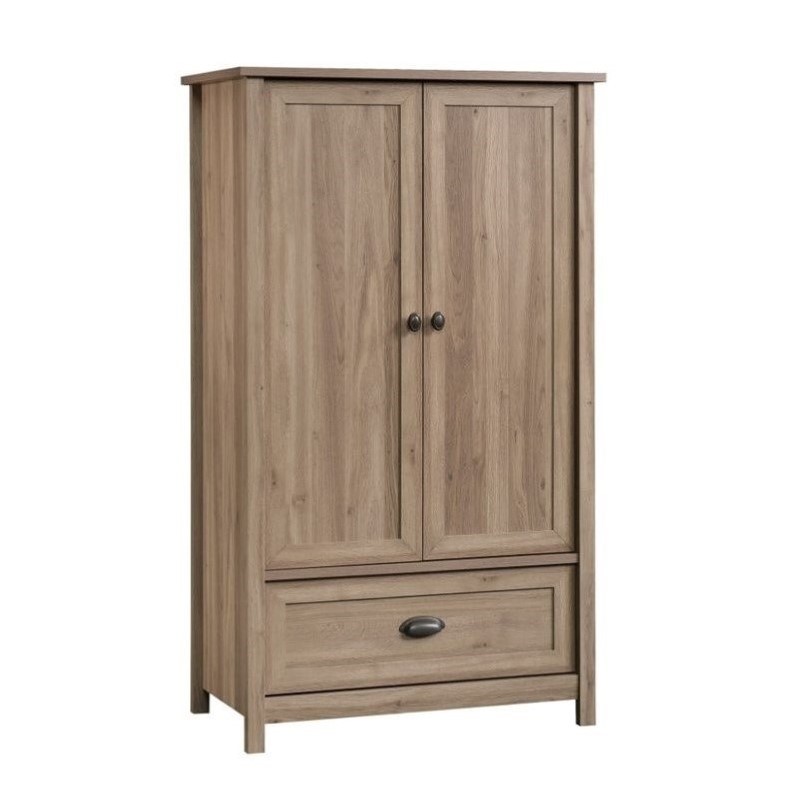 | Sauder - Armoires - 419458 - Finish: Salt Oak; Materials: Engineered Wood; Quick and easy assemlby with patented T-slot drawer system; 2 adjustable shelves behind doors; Drawer features metal runners and safety stops. Specifications:Overall Product Dimensions: 56.97 "" H x 33.31 "" W x 18.58 "" D; Overall Product Weight: 122 lbs.