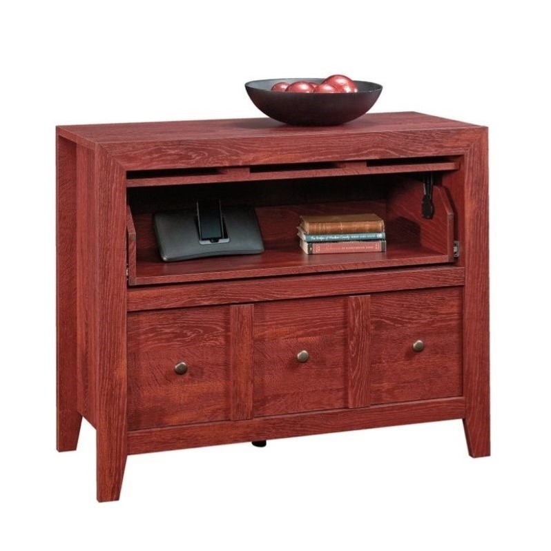 | Sauder - TV Stands - 418231 - Finish: Fiery PineVanishing Drawerâ„¢ with full extension slides hides components behind flip-up frontLower drawer with metal runners and safety stops features patented T-lock drawer systemEnclosed back with cord accessSpecifications:Overall Product Dimensions: 31"" H x 37.6"" W x 17.5"" DProduct Weight: 95 lbsAccommodates up to a 42"" TV weighing 50 lbs or less