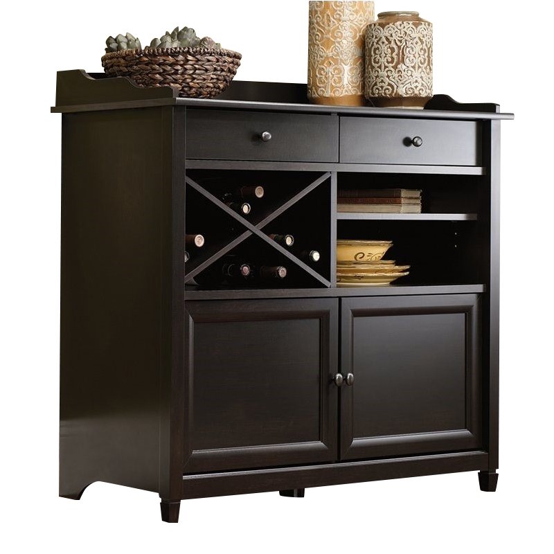 | Sauder - Buffet Tables & Sideboards - 414844 - Gallery display top. Criss-cross rack storage. Two adjustable shelves. Drawers with metal runners and safety stops feature patented T-lock assembly system. Solid wood accents. Enclosed back with cord access. Finish: estate black; Includes 2 drawers and 2 adjustable shelves; Made of solid wood; Gallery display top; Criss-cross rack storage. Specifications:Overall Dimensions: 41.62"" H x 43.78"" W x 18.08"" D.