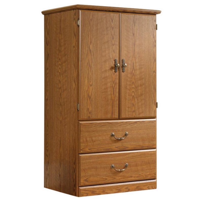 | Sauder - Armoires - 401292 - This bedroom armoire features two adjustable shelves behind the doors. Below this storage area are two drawers on metal runners and safety stops featuring the patented T-lock assembly system. Use this armoire for your clothes, as a TV stand, as a linen closet or for your office supplies. This armoire is constructed from high quality hard wood and soft wood materials, veneered and laminated with a Carolina Oak finish. The T-lock assembly will save you time while assembling your armoire. This assembly system eliminates the use of screws allowing you to build the drawers in half the normal time. Two adjustable shelves behind doors ; Two drawers with metal runners and safety stops feature patented T-lock assembly system ; Carolina Oak finish.