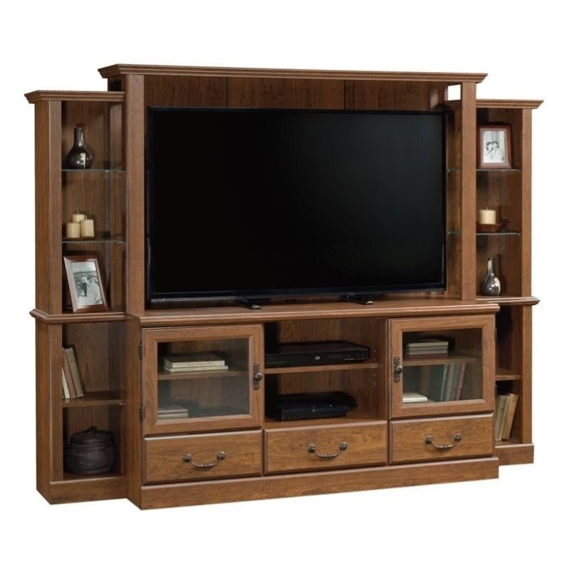 | Sauder - Entertainment Centers - 418653 - Finish: Milled CherryTV should be mounted to back wall (wall mount conversion kit not included)Two adjustable shelves behind framed, safety-tempered glass doorsCenter adjustable shelf holds audio/video equipmentSix adjustable display shelvesThree drawers with patented T-lock drawer systemSpecifications:Overall Product Dimensions: 63.3"" H x 82.2"" W x 19.5"" DProduct Weight: 257 lbsAccommodates up to a 42"" TV weighing 95 lbs or less