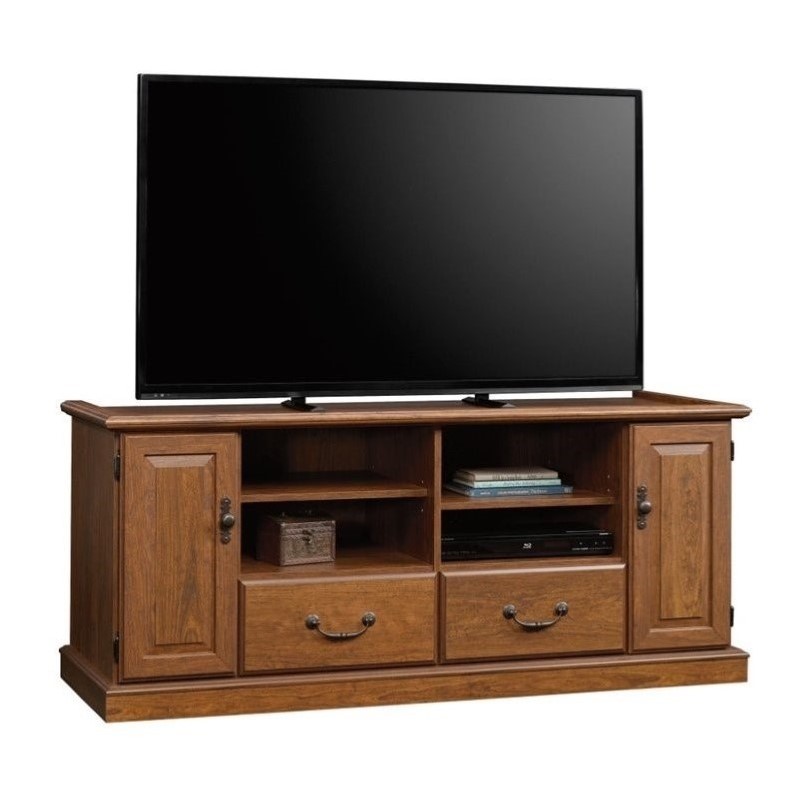 | Sauder - TV Stands - 418654 - Finish: Milled CherryTwo adjustable shelves hold audio/video equipmentStorage area behind doors has an adjustable shelf and holds 88 CDs or 68 DVDsDrawers with metal runners and safety stops 140 CDs or 56 DVDsQuick and easy assembly with patented T-lock drawer systemSpecifications:Overall Product Dimensions: 25.5"" H x 59.7"" W x 21.2"" DProduct Weight: 144 lbsAccommodates up to a 55"" TV weighing 135 lbs or less