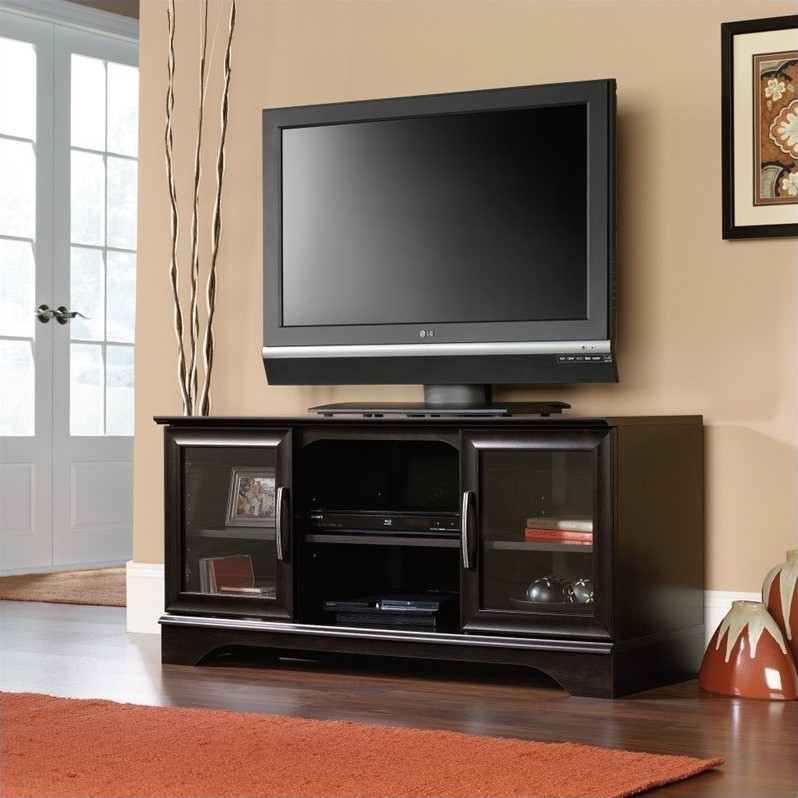 | Sauder - TV Stands - 412701 - Estate Black finish; TV mount with built-in cord management features height and swivel adjustment; Adjustable center shelf holds audio/video equipment; Adjustable shelf behind each framed, safety-tempered glass door; Enclosed back panel with cord access. Specifications:Overall product dimensions: 22 5/8"" H x 47 1/8"" W x 17 1/2"" D; Mount/stand accommodates up to a 50” TV weighing 95 lbs. or less.