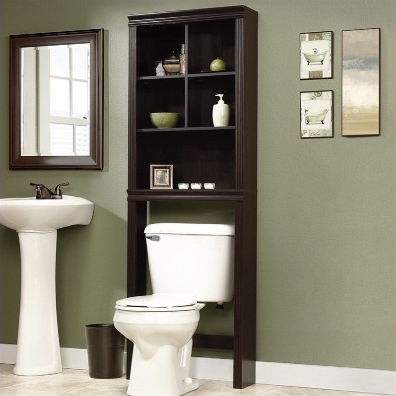 | Sauder - Spacesaver - 414573 - Space-saving cabinet fits over toilet. Cubbyhole storage features two adjustable shelves. Quick and easy assembly with patented slide-on mouldings. Finish: Cinnamon Cherry; Includes cubbyhole storage with two adjustable shelves; Space-saving cabinet; Quick and easy assembly with patented slide-on moldings. Specifications:Overall Dimensions: 68.59"" H x 23.31"" W x 7.41"" D; Product Weight: 34 lbs.