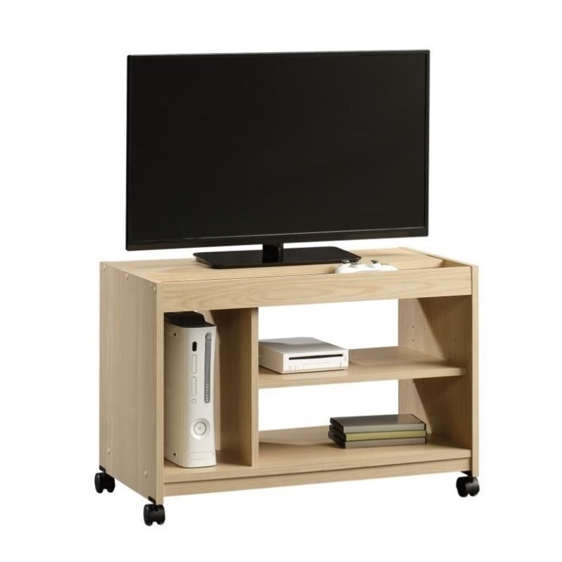 | Sauder - TV Carts - 416822 - Finish: Urban AshAdjustable shelf holds audio/video equipmentVertical game storage cubbyTray for remotes, controllers, etcEasy-roll castersReversible accents in Urban Ash or Soft White finishSpecifications:Overall Product Dimensions: 20.2"" H x 29.4"" W x 15.5"" DProduct Weight: 39 lbsAccommodates up to a 32” TV weighing 25 lbs or less